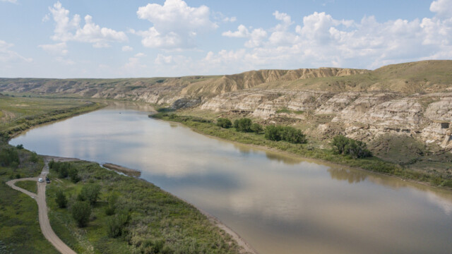 Auf unserer Weiterfahrt kommen wir am Fluss South Saskatchewan River vorbei. Es führt eine schöne türkisfarbene Stahlbrücke darüber und auf der anderen Flussseite gibt es schöne Felsformation, wir sind am Beginn der Badlands. Die Fotos vom Boden begeistern mich irgendwie nicht so richtig, deshalb versuche ich auch hier den Blick von oben, und auch hier: Wau.