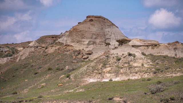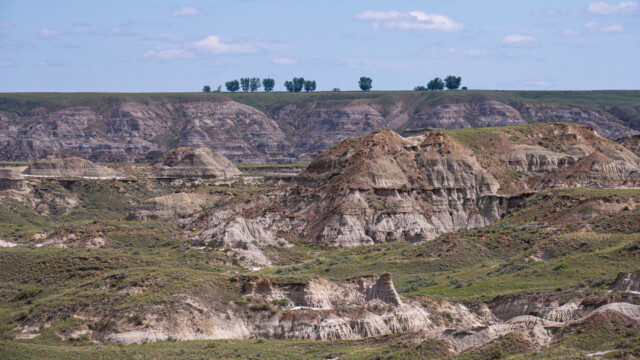 Mitten in den Badlands wurden schon von den Ureinwohnern Nordamerikas (First Nations) uralte versteinerte Knochen gefunden. Sie gingen davon aus, dass es sich um die direkten Vorfahren der riesigen Bison-Herden handelte und deshalb wurden diese Relikte spirituell verwendet und verehrt. Als im 19. Jahrhundert europäische Geologen dieses Gebiet auf das Vorhandensein von Öl untersuchten und dabei unzählige dieser versteinerten Knochen und Skelette entdeckten war ihnen rasch klar, dass es sich um versteinerte Dinosaurier handeln musste. Es entstand bald ein regelrechtes Rennen der europäischen Museen, wer die grössten und vollständigsten Skelette dieser Spezies ausstellen konnte. An keinem Ort der Erde wurden auf so einer kleinen Fläche so viele versteinerte Knochen und Skelette von Dinosaurier gefunden, hier meist um die 75 Millionen Jahre alt. Und viele warten noch auf die Ausgrabung.