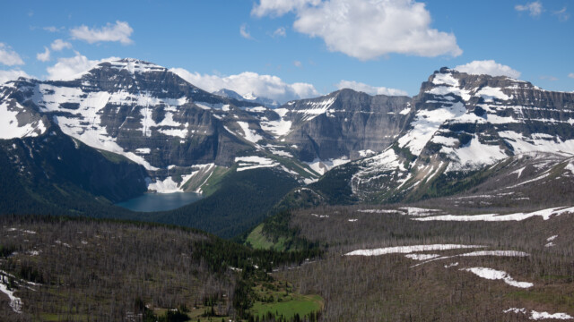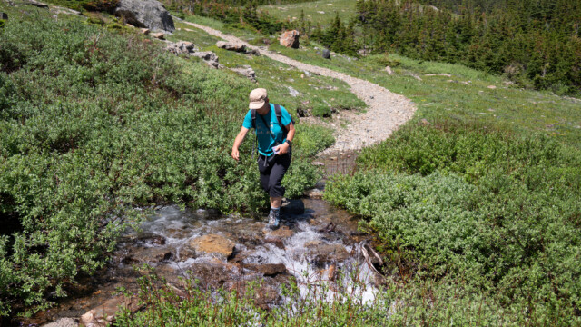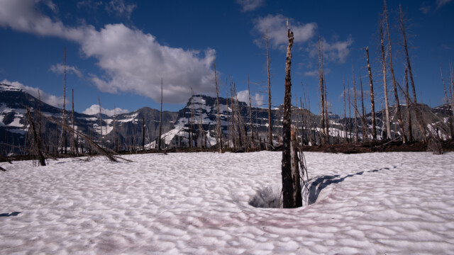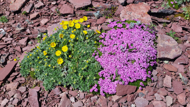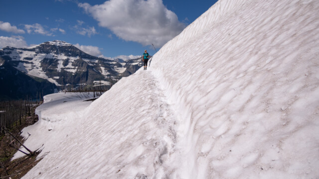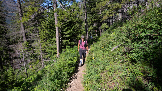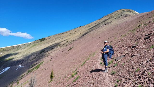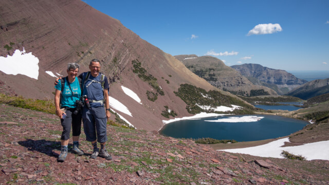 Wie erwartet gleicht die Landschaft schon etwas den Alpen, aber diese felsigen Berge (Rocky Mountain) gefallen uns. FĂĽr den Juli hat es noch erstaunlich viel Schnee und wir mĂĽssen beim Aufstieg auf knapp 2’500 mĂĽM mehrere Schneefelder ĂĽberqueren, auch beim Abstieg hat es mehrmals Schneefelder, zwar kĂĽrzer aber dafĂĽr steiler. Aber es geht und ist nicht gefährlich, man braucht keine Steigeisen oder so.