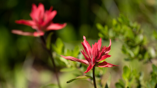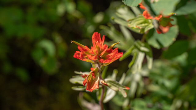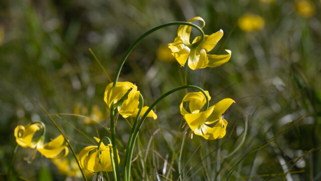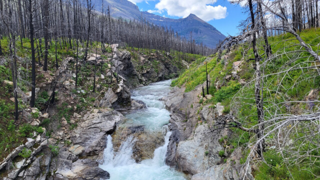 Wir gehen weiter und machen Lärm, d.h. klatschen in die Hände und reden laut, so dass der Bär uns hören kann und nicht plötzlich in uns hinein läuft. «Dank» dem abgebrannten Wald haben wir eine gute Sicht, sehen zwischen den kahlen Stämmen hindurch auf die andere Talseite. Am Boden blĂĽhen teilweise Blumen und es hat viel Gras. Neue Bäume sehen wir erst selten, gemäss der Shuttle-Busfahrerin geht es 50 – 80 Jahre, bis der Wald vollständig ersetzt ist. «DafĂĽr hat es jetzt viel mehr Blumen als sonst, insbesondere dieses Jahr gibt es viel mehr Bärengras, wahrscheinlich weil die Sonne jetzt besser an den Boden kommt», erzählt sie uns. In Wikipedia lesen wir noch, dass das Bärengras oft die erste blĂĽhende Blume nach einem Waldbrand ist, da ein wichtiger Teil der Wurzel die Hitze ĂĽberlebt.