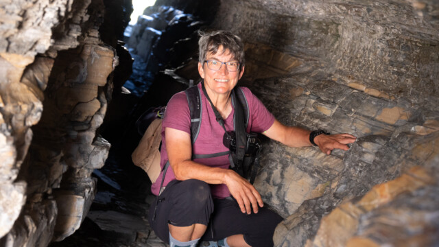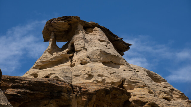 Unser Höhepunkt ist eine dreistĂĽndige FĂĽhrung, die wir mit der jungen Rangerin Emma im gesperrten Gebiet unternehmen können. Sie erklärt, wie die Dinosaurier hier im Flusssand gelebt haben und gestorben sein könnten, dann rasch vom Sand zugedeckt wurden und sich die Hohlräume der Knochen langsam mit Mineralien fĂĽllten und so das Skelett versteinerte. Vom ursprĂĽnglichen Knochen sei praktisch nichts mehr vorhanden. Der die Knochen umschliessende Sand wurde dabei zu Sandstein gepresst und so konnte der ganze Versteinerungsprozess ĂĽber die Jahrmillionen geschĂĽtzt werden, welch ein GlĂĽck fĂĽr uns heute. Die letzte Eiszeit endete hier vor rund 10’000 Jahren und es entstanden neue FlĂĽsse. Diese sowie auch Regen und Luft verursachen nun eine Erosion am Sandstein, welche die Knochen und Skelette langsam wieder an die Oberfläche bringen. An mehreren Orten sehen wir Knochenteile aus dem Sandstein ragen, irgendwie surreal. Diese Teile wurden noch nicht ausgegraben oder man ist gerade daran, einmalig dieser Einblick.