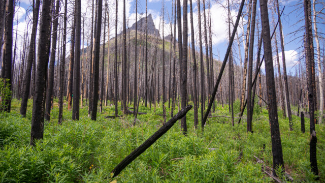 Wir haben diesen Nationalpark nicht nur ausgewählt, weil er nicht so ĂĽberlaufen sein soll, sondern auch weil 2017 hier ein grosser Waldbrand nach einem Blitzschlag je nach Quelle 40 – 70% des ganzen Baumbestandes zerstörte. In unserem ReisefĂĽhrer wurde deshalb eher skeptisch darĂĽber geschrieben, doch wir wollten sehen, wie weit die Natur fĂĽnf Jahre danach ist. Wir finden es interessant, die abgebrannten Bäume anzuschauen, riesige Flächen. Manchmal sind die Bäume noch ganz schwarz und verkohlt und manchmal sind sie ganz weiss, weil die Rinde abgefallen ist, sehen auf den ersten Blick fast wie Birken aus. Einige wenige Male sehen wir auch nur noch die Rinde stehen und der innere Teil des Baumes fehlt.