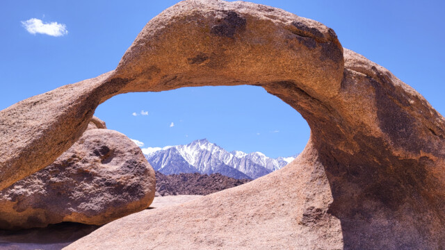 Westlich der Alabama Hills liegt der höchste Gebirgszug der USA (Lower 48, d.h. ausserhalb von Alaska, Hawaii und sonstigen Überseegebieten), die Berge sind hier bis über 4’000m hoch und meistens noch schneebedeckt. Zu unserer Überraschung ist allerdings der höchste Gipfel, der 4’418m hohe Mount Whitney ganz ohne Schnee.