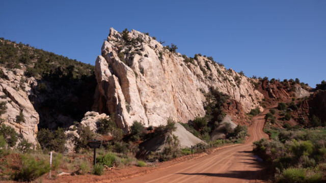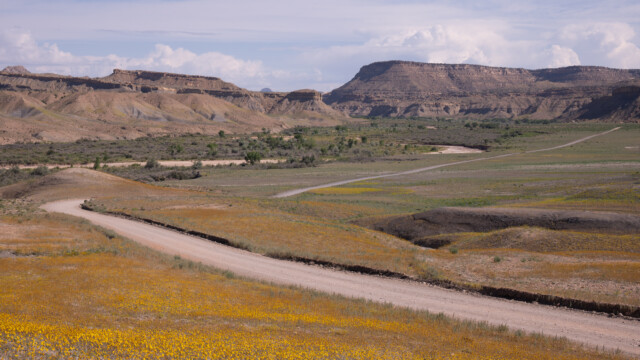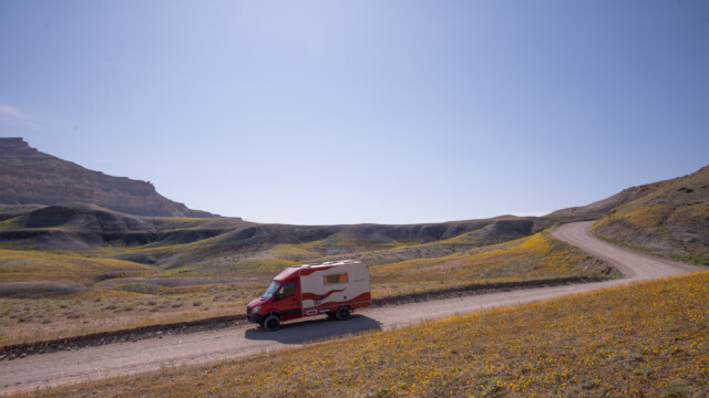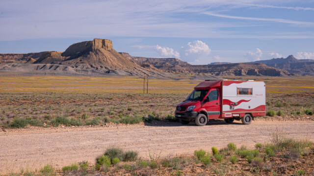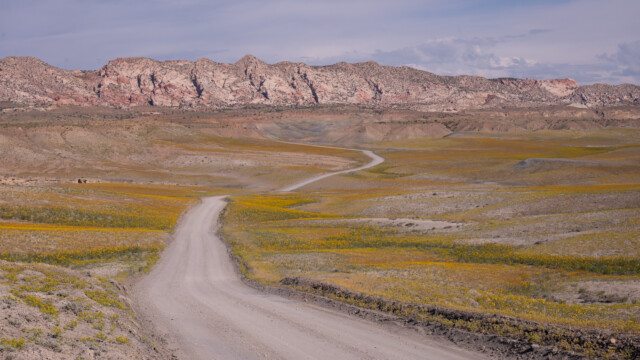 Auf dieser knapp 80 km langen Piste wollen wir das Grand Staircase + Escalante National Monument von Süd nach Nord durchqueren. Bevor wir richtig reinfahren füllen wir unsere Wasservorräte nochmals auf, denn es ist möglich, dass wir wegen schlechtem Wetter etwas warten müssen. Die ersten Kilometer sind wunderschön, viele gelbe Blumen blühen, Frühling, wir sind absolut begeistert.