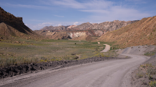 Beim Uper Buckskin Trail können wir die wunderbaren rot-weiss Formationen an der Oberfläche beobachten. Allerdings müssen wir lange warten, bis die Sonne durch die vielen Wolken scheint, meinem Rücken gefällt das gar nicht…