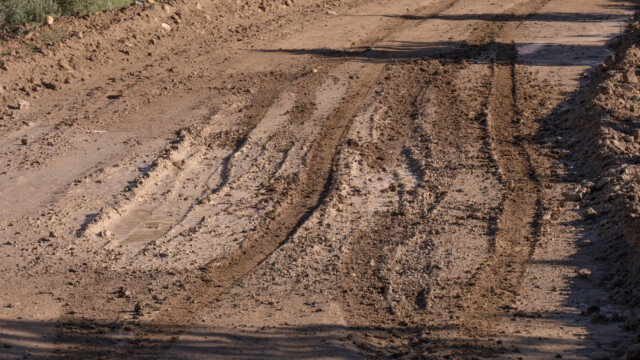 Als wir weiterfahren, fallen bereits die ersten Tropfen und die Strasse wird relativ rasch schmierig. Wir hören, dass das ABS (Antiblockiersystem) von Jupi im Dauereinsatz ist. Bettina ist am Steuer und meint, es fühle sich an wie auf Seife, extrem rutschig. Unser Pneu-Profil füllt sich im Nu mit Matsch und man spürt gut, wie wir auf der Strasse hin- und her schlittern. Der Regen kommt von der Richtung, in die wir wollen, Norden. Die Strasse wird immer mehr unbefahrbar. Wir fragen uns: «Sollen wir einfach hier stehen bleiben und abwarten oder zurückfahren?» Etwa 100m weiter ist die Strasse etwas breiter und Bettina kann wenden. Dann fahren wir etwa 2 km Richtung Süden zurück, wo wir einen Parkplatz gesehen haben. Es donnert immer wieder und erst am Abend hört es auf zu regnen, die Strasse ist jetzt wohl absolut unbefahrbar, deshalb bleiben wir über Nacht hier. Wie so oft in den letzten Tagen verziehen sich die Wolken am späten Abend und die Nacht ist klar.