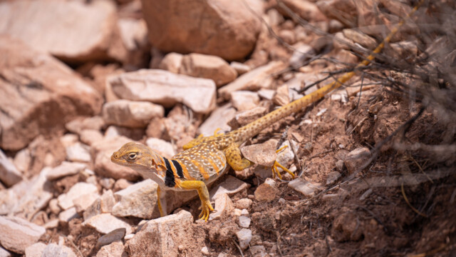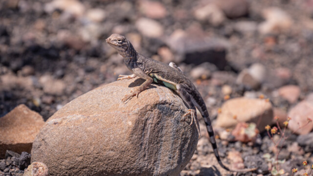Beim Hinunterwandern entdecken wir sozusagen als Zugabe noch eine wunderschöne gelbe Eidechse, mit schwarzen und gelben Bändern um den Hals. Eine so schöne haben wir bisher noch nie gesehen und gemäss Internet handelt es sich um einen Halsbandleguan.