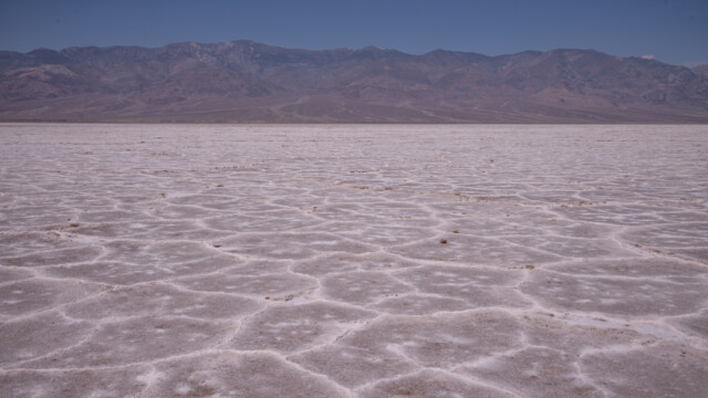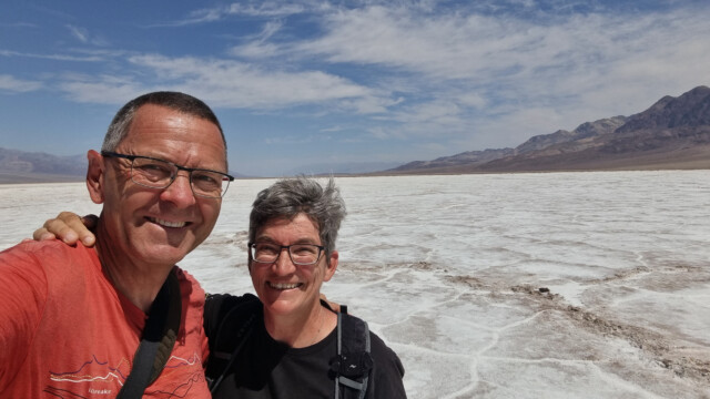 Wir suchen vergeblich nach den mehreckigen weissen Salzpfannen, die es hier geben soll und gehen deshalb am nächsten Tag noch einmal ins Visitor-Center. Hier teilt man uns mit, dass wir mindestens 1.5 km weit in die Ebene hinauslaufen müssen, am besten morgens zwischen 5 – 6 Uhr. Das ist uns definitiv zu früh, denn um diese Zeit ist die Sonne noch nicht über dem Horizont. Darauf schaut uns die Rangerin genau an und sagt dann: «Ihr seht fit aus. Heute wird es nur etwa 32°C heiss, ihr müsst einfach genügend Wasser mitnehmen.»