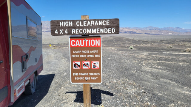 Um unser Haupt-Ziel anfahren zu können, reduzieren wir wieder einmal den Luftdruck an Jupi, 3.2 – 3.5 statt 4.8 – 5 bar. Vor uns liegen 40 km Naturstrasse zu einem ganz besonderen Ort: Auf einem ausgetrockneten See hat es Spuren von Felsbrocken, die sich bewegen. Den Weg dorthin müssen wir uns über eine teilweise üble Waschbrettpiste erfahren, d.h. etwa 28 km sind normal – sehr gut befahrbar, aber auf etwa 12 km ist man dauernd am Suchen von flachen Stellen. Am Anfang der Strasse steht zwar, dass 4×4 und hohe Bodenfreiheit notwendig seien, bis zu den wandernden Felsen ist das aber sicher nicht so.