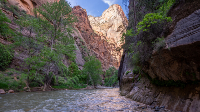 So fahren wir mit dem Shuttle ganz hinten in den Zion Canyon und unternehmen den Riverside Walk, wo wir bis zum Startpunkt der Narrows kommen, einem Wanderweg der mehrheitlich durch den Fluss führt und zur Zeit wegen zuviel Wasser gesperrt ist. Auch beträgt die Wassertemperatur im Moment nur 4°C, brrrrr.
