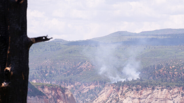 Auf dem Rückweg entdecken wir einen Waldbrand. Komisch, den haben wir doch auf dem Hinweg noch nicht gesehen? Tatsächlich habe ich genau an diesem Punkt auf dem Hinweg bereits ein Foto gemacht und da ist noch nichts zu sehen. Kurz danach kommt eine Rangerin und fragt, ob man auf meinem Foto den Waldbrand gut sehen könne, sie möchte die Grösse abschätzen. Ich zeige ihr beide Bilder und sie äussert dann die Vermutung, dass Camper das Feuer ausgelöst hätten. Sie habe es der Zentrale bereits gemeldet.