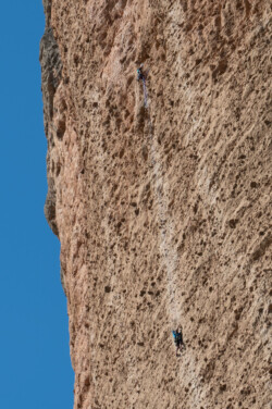 Danach ging es hinauf nach Riglos, wo die Gemeinde für die Camper zwei Gratisstellplätze zur Verfügung stellt, aber auch klar definiert, wo wir Camper nicht stehen resp. übernachten dürfen. An unserem Stellplatz über der Gemeinde gab es sogar frisches Quellwasser, so dass wir all unsere leeren Mineralflaschen damit füllten. Es schmeckte bestens. Wir kamen am Freitagabend an und waren die dritten auf dem Stellplatz, der sich aber bis um 23 Uhr komplett füllte, alles jüngere Kletterinnen und Kletterer. Wir waren mit unserem 6.19m langen Bimobil EX366 für einmal die grössten, die meisten sonst hatten umgebaute VW- oder Renault-Transporter, wenige auch Fiat-Ducato Kastenwagen. Den übrigen normalen Campern («Weissware») schien die Anfahrt zu steil zu sein und sie parkten auf dem tiefer liegenden Stellplatz.