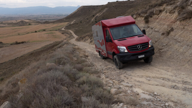 Aus unserem Büchlein «Pisten-Truck Spanien Offroadstrecken» vom MDMOT-Verlag wollten wir heute eine oder zwei einfache Routen abfahren. Zu unserer Überraschung war aber die erste Route sehr ausgewaschen und an dieser Stelle auch recht steil, so dass wir das volle Register unseres Bimobil EX366 resp. des Mercedes Sprinters zogen: Luftdruck reduzieren, 4×4 aktivieren sowie Getriebeuntersetzung einlegen. Damit kamen wir problemlos diese Steigung hoch. Später fehlte dann der im Track eingezeichnete Abzweiger und es ging nochmals einige hundert Meter durch mit hohem Gras zugewachsene und ausgelaugte Feldwege. Da schlug doch unser Offroad-Herz wieder höher. Am Schluss gab es eine Stärkung bei einer alten Brunnenanlage, die gemäss unserem Büchlein schon zu Römerzeiten errichtet worden war.
