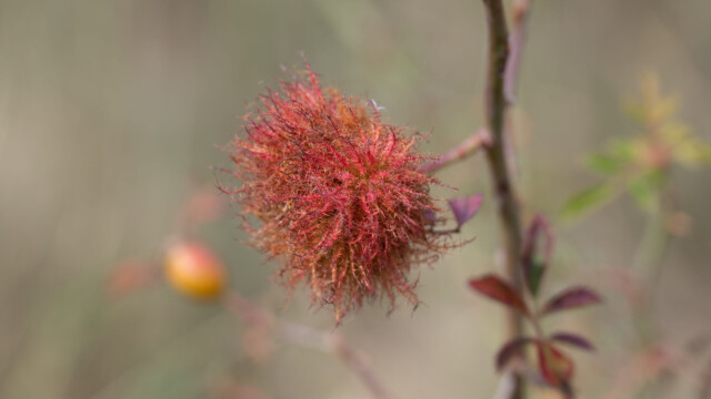 Was wir auch mehrmals sahen waren Stauden mit reifen Hagenbuttenfrüchten, die aber auch ein paar undefinierbare rot-orange-gelbe Knäuel hatten. Keine Ahnung, was für ein Schmarotzer sich hier zu schaffen macht, aber optisch sah es sehr schön aus.