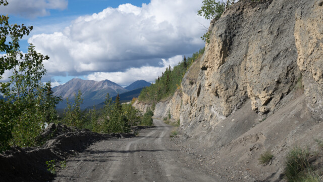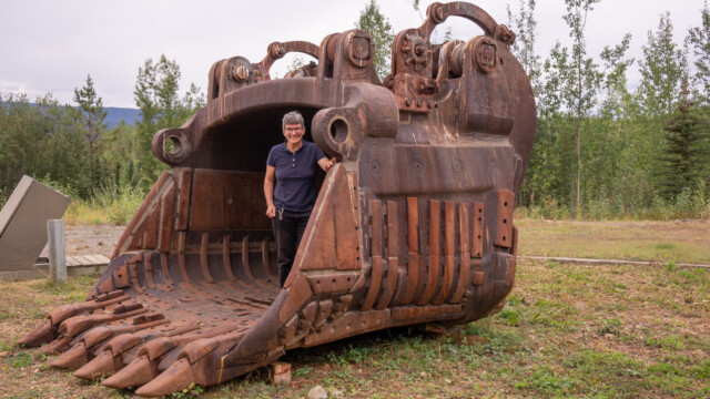 Auf dem Weg zurück zum Klondike-Highway nehmen wir eine etwas andere Route und fahren von Keno-City nach Mayo nicht auf dem Silver-Trail sondern nehmen die Duncan Creek Road, eine etwas schmalere und weniger befahrene Piste. Am Anfang warnen Schilder, dass hier grosse Maschinen auf den Strassen unterwegs sind und tatsächlich kreuzen uns bald zwei Sattelschlepper. Und dann steht plötzlich ein Riesenbagger vor uns, er ist viel zu breit zum kreuzen. Der Führer steigt aus, kommt lächelnd auf uns zu und fragt ganz höflich, wie es uns gehe und so. Dann meint er ganz cool, wir seien ja schneller als er und sollten bitte hinter die nächste Kurve zurückfahren, er werde dort dann ganz an den Rand fahren. Und so klappte es dann tatsächlich, Jupi ist ja ein schmaler.
