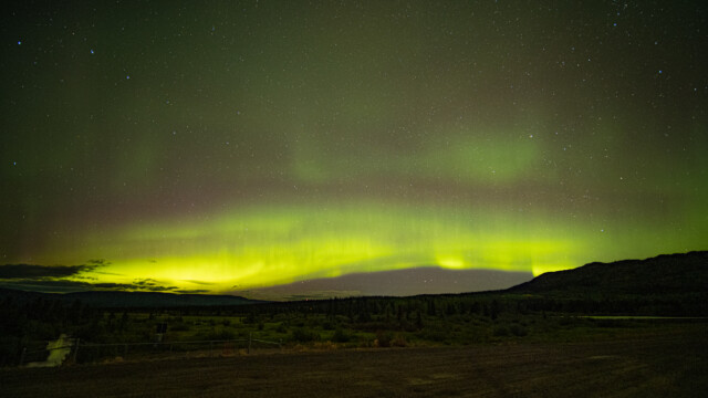 Wir bleiben einige Tage in der Umgebung von Whitehorse, auch weil die Polarlicht- und Wettervorhersagen gut sind. Wir fahren rund 20 km in den Norden zum Fish-Lake auf rund 1’100 müM, einer Art Hochebene. Tatsächlich haben wir Glück und schon in der ersten Nacht an diesem Ort sehen wir die Polarlichter, es tanzt zwar nicht so wie in Dawson-City, scheint aber doch recht intensiv. Wieder beginnt das Spektakel um 23:30 Uhr, zuerst nur ganz schwach, dann immer stärker. Bis fast gegen 2 Uhr morgens schauen wir uns die Lichter an, am Schluss beobachten wir sie vom Bett aus im Jupi. Wir betrachten auch sonst die Sterne und Sternbilder, auch die Milchstrasse zeigt sich, wenn auch wegen des Polarlichts nicht ganz so intensiv wie sonst.