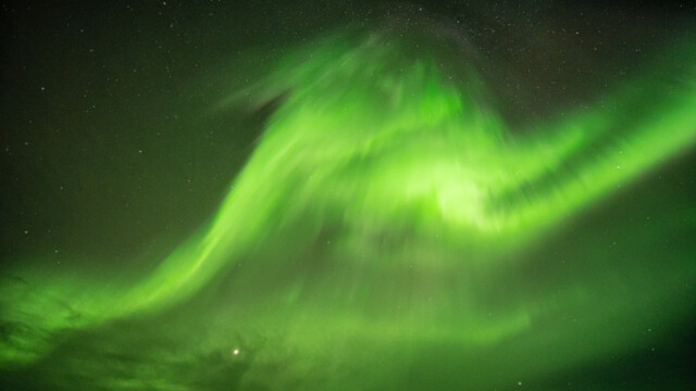 Die Polarlichter sind diese Nacht aber extrem intensiv, sie kommen bereits etwas früher als in den vergangenen Tagen und die Ausdehnung ist von Anfang an viel grösser, oft über den ganzen Himmel. Und es gelingt uns noch ein ganz spezielles Bild: Unser Jupi unter seinem Namensgeber, dem Planeten Jupiter und unter intensivem Polarlicht.