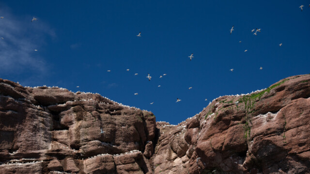 Nach gut einer Stunde ist die Rundfahrt vorbei und wir landen auf der Insel an. Nach einer kurzen Einführung durch örtliche Ranger können wir uns frei bewegen und nehmen die 3.3km zur Basstölpelkolonie unter die Füsse. Es geht durch Wald und hier ist kein Windchen zu spüren, entsprechend ziehen wir eine Schicht nach der andern wieder aus. Am Ziel unserer Sehnsüchte angekommen befinden wir uns mitten in einer Kolonie von Basstölpeln, es gibt ein grosses Geschnatter, laufend kommen Vögel an und fliegen ab und am Boden streiten oder lieben sie sich. Die Vögel sind jetzt am Brüten, schlüpfen würden sie so um den 24. Juni erzählt uns eine Rangerin. Obwohl das Schiff eigentlich gut besetzt war, geht es mit den Leuten und wir können wunderbar fotografieren, es hat noch etwa sechs oder sieben andere Fotografen. Es hat Picknick-Tische und sogar Toiletten, perfekt.