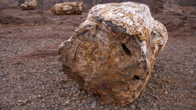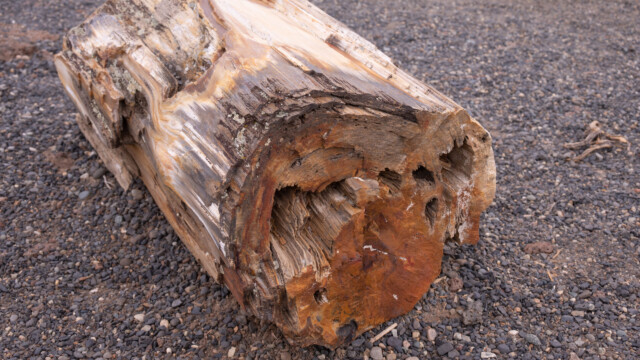 Wir lesen hier auch, wie die Versteinerung der Baumstämme vonstatten ging: Vor vielen Millionen Jahren gab es in dieser Gegend sehr aktive Vulkane. Die Bäume wurden bei einem Vulkanausbruch ins Wasser geschleudert und waren so sicher vor der Hitze, wurden dann aber vom Ascheregen etc. bedeckt. Das Holz zersetzte sich langsam und wurde durch Mineralien ersetzt. Und diese Gebilde kommen heute wieder langsam an die Oberfläche. Voilà , so einfach.