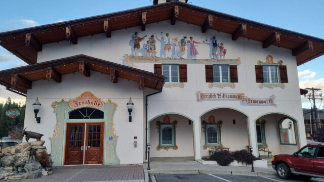 In unserem Reiseführer haben wir von Leavenworth gelesen und wollen es auch mit eigenen Augen sehen. Tatsächlich wurde hier in den sechziger Jahren das ganze Dorf auf Bayrisch umgebaut und es wurde von der serbelnden Holzindustrie auf die Tourismusindustrie gewechselt. Wir lesen, dass ungefähr ein Viertel der Einwohner deutschstämmig seien. Tatsächlich sind sehr viele Strassen und Wegweiser zweisprachig angeschrieben, englisch und deutsch. Und die Häuser haben auch ein europäisches Aussehen, fast alles Riegelbauten. Natürlich lassen wir es uns nicht nehmen, zum Mittagessen eine Bratwurst mit Sauerkraut und einem Bretzel zu essen, es schmeckt uns ausgezeichnet.