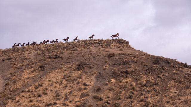 Bei der Rückfahrt sehen wir in der Ferne noch eine Herde Pferde auf einem Hügel. Sie galoppieren alle auf einen Abgrund zu, wenn das nur gut kommt. Das müssen wir uns genauer anschauen: