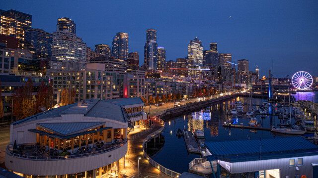 Wir bleiben natürlich bis zur blauen Stunde. Wie in Vancouver leuchten auch hier die vielen Wolkenkratzer wunderschön vor dem blauen Nachthimmel. Und dann sehe ich ihn plötzlich ganz schwach in der Dämmerung: Der Mt. Rainier, der nur 10% der Zeit von Seattle aus sichtbar ist, was haben wir für ein Glück. Das letzte Mal ist der Vulkan übrigens 1894 ausgebrochen…