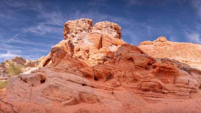 Der Valley of Fire State Park hat seinen Namen von den roten Sandsteinformationen. Auf den 141 km2 entdecken wir aber nicht nur Felsen in rot, sondern in noch viel mehr Farben und Schattierungen. Zusätzlich hat die Erosion im Laufe der Jahrmillionen viele Steinbrücken aus dem Sandstein geschliffen (Arches genannt) und sogar einen Steinelefanten. Es ist ein wunderschönes und spannendes Spektatel für die Augen, das wir hier besuchen.
