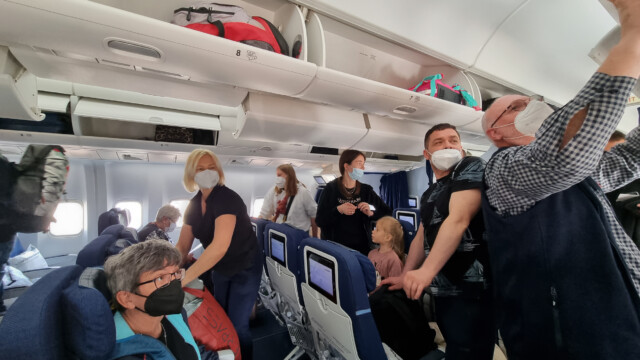 Das Flugzeug ist praktisch voll und es hat sehr viele Personen mit ukrainischem Pass. Gegen Ende des Fluges wird mehrmals darauf hingewiesen, dass für eine Einreise nach Kanada unbedingt die ArriveCan-App notwendig sei, wer seine Daten darin noch nicht hochgeladen habe, müsse dies noch vor der Immigration machen.