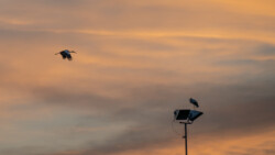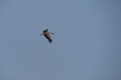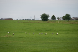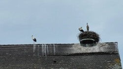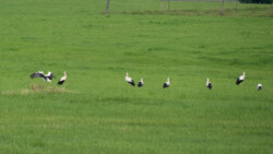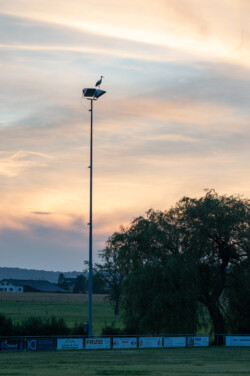 Wir entdecken auf jedem Lampenmast des Fussballplatzes einen Storch, scheinbar ist das deren Übernachtungsquartier. In der Nacht regnet es sehr stark und am Morgen stehen sie etwas zersaust im benachbarten Feld, strecken die Flügel wie Kormorane zum Trocknen aus, putzen sich das Gefieder und die ersten suchen im Boden schon nach irgendwelchen Leckereien. Bei einer Velotour entdecken wir in der Nähe eine Kirche mit zwei Storchennesten.
