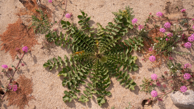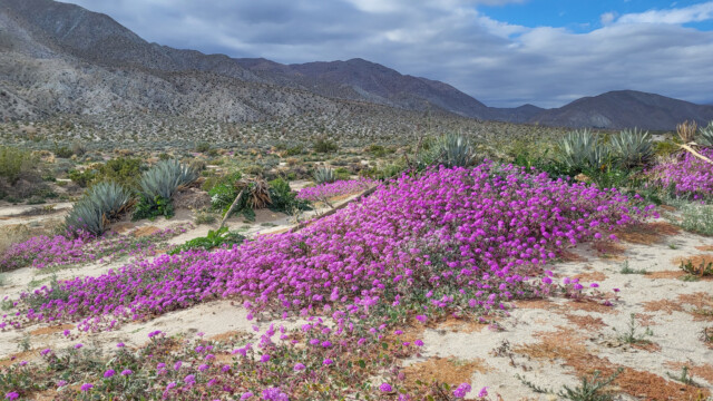 Wir fahren immer noch in der Sonora-Wüste, kommen aber näher an die Pazifik-Küste und die Wüste wird immer grüner. Gemäss Wikipedia fallen in diesem Teil der Sonora-Wüste bis zu 500 mm Regen pro Jahr und es ist damit die feuchteste Wüste der Welt, dass es auch die grünste Wüste der Welt ist, haben wir bereits gewusst. Neben vielen grünen Gebüschen und einigen Kakteen hat es immer wieder violette Blumen.