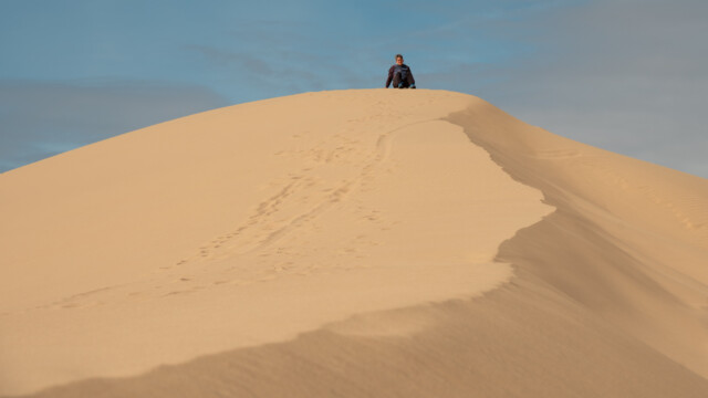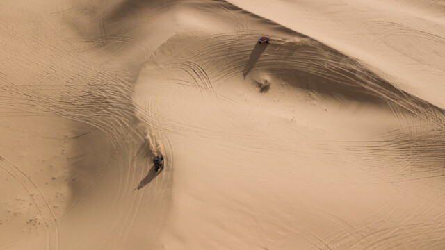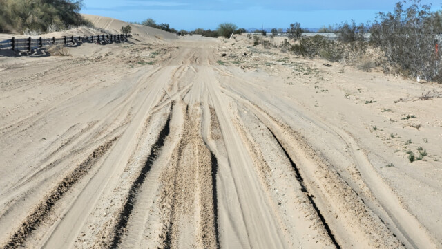 Die grossartige Dünenlandschaft, ca. 70 km x 9 km in den Abmessungen, ist an den meisten Orten frei zugänglich und wird als Piste für alle Arten von Offroadfahrzeugen genutzt, vorallem grössere Quads, hier auch Off Highway Vehicle (OHV) genannt, d.h. nicht für den Strassenverkehr zugelassene Fahrzeuge. Wir fahren auf der parallel zur Düne führenden Piste, die manchmal auch etwas sandig und weich ist, meistens aber sehr holprig, so dass seit langem wieder einmal die obere Matratze vom Bett runter fällt. Fast 40 km führt diese Sandpiste entlang der Dünen und wir suchen gute Fotospots, denn die Ansicht aus der Drohne, d.h. von oben, gefällt uns auch hier sehr.