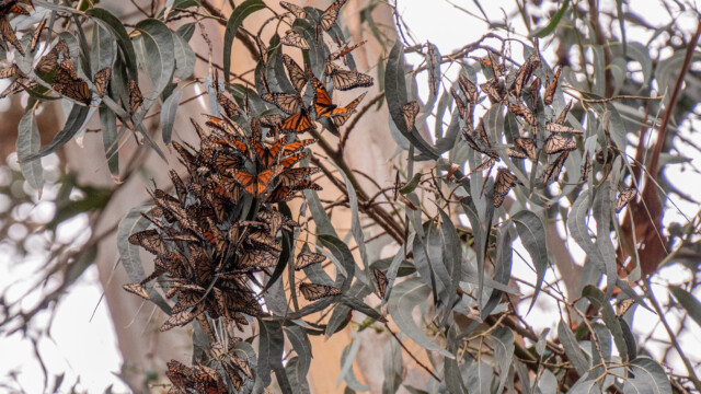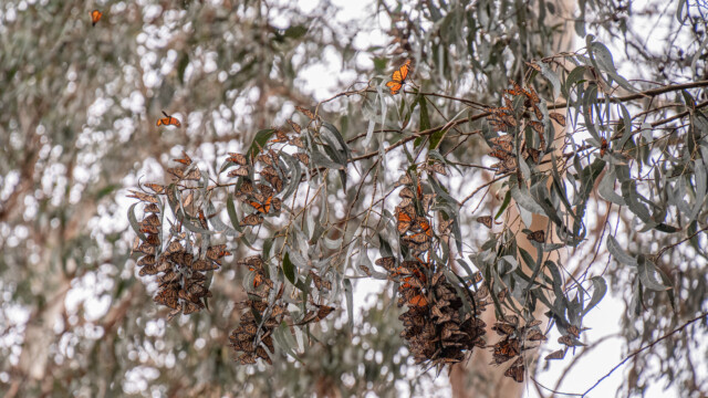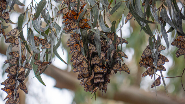 Wie es wohl den Schmetterlingen bei diesem Wetter geht? Der Park, wo die Monarch-Falter überwintern, ist heute gesperrt, wir können nicht rein. Aber das Zusammenrücken zu Ansammlungen (Cluster) soll sie vor Regen, Wind und Kälte schützen, so lesen wir.