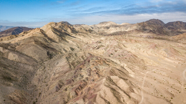 Wir übernachten abseits der Dünen und fahren am nächsten Morgen weiter zu den farbigen Bergen in den Carizzo Mountains. Der Highway zur Anfahrt in die «Painted Gorge», die angemalte Schlucht, ist in einem miserablen Zustand. Es wimmelt von Löchern und Rissen im Teer, so schlechte Asphalt-Strassen hatten wir noch nie in den USA, erinnert uns an Kasachstan… Auch die anschliessende Naturstrasse durch die Berge, die Painted Gorge – Road, ist nicht ganz ohne: Teilweise ist sie sehr sandig sowie weich und dann wieder so ausgewaschen, dass Jupi mit einem Rad ziemlich hoch in die Luft ragt. Der Federweg unseres Mercedes Sprinter ist nur sehr kurz, nicht für stark unebenes Gelände (Buckelpiste) geeignet, zusammen mit dem starren Chassis lässt das kaum Verschränkung zu. Unimog-Fahrer haben dafür natürlich nur ein müdes Lächeln übrig, das ist ihr Terrain…