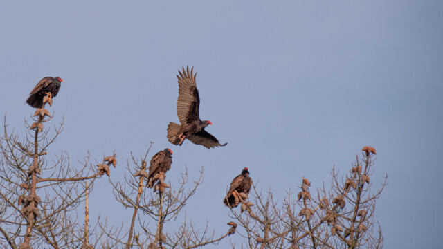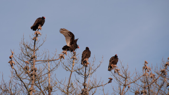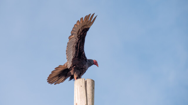 Doch fangen wir von vorne an: Wir sind am Morgen sehr früh wach und entschliessen uns, den weitläufigen Camping-Platz etwas zu erkunden, insbesondere der Teil, der wegen Unwetter geschlossen ist. Es ist noch absolut ruhig und wir treffen auf verschiedenen Bäumen Truthahn-Geier an, die sich am Strecken, am Flügel trocknen und am Gefieder putzen sind. Mit der Zeit fliegt einer nach dem andern weg und wir sehen sie bald am Himmel kreisen.