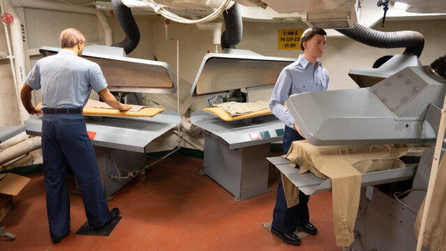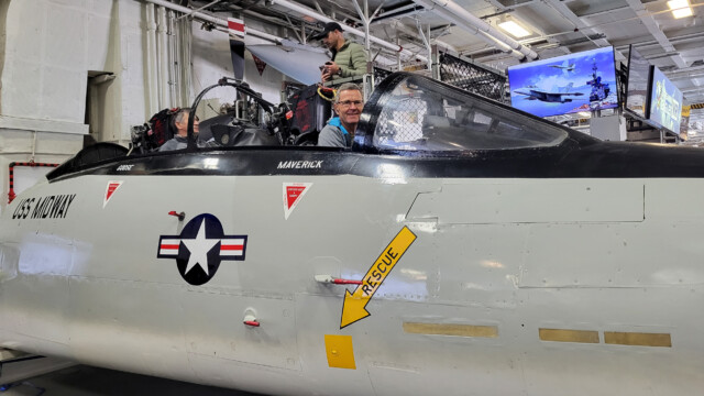 In San Diego wollen wir den Flugzeugträger USS Midway besuchen. Er stand von 1945 bis 1992 im aktiven Einsatz, hatte also am Anfang noch Propellerflugzeuge an Bord, wurde dann laufend um- und aufgerüstet, auch mit Dampfkatapulten, so dass am Schluss auch die F/A-18 Hornet darauf starten und landen konnten. So ein Flugzeugträger ist eine kleine Stadt, 4’000 Personen arbeiteten und lebten auf diesem Exemplar, der Chef war ein Admiral. Es gibt diverse Küchen, auch ein Spital, eine Wäscherei etc.