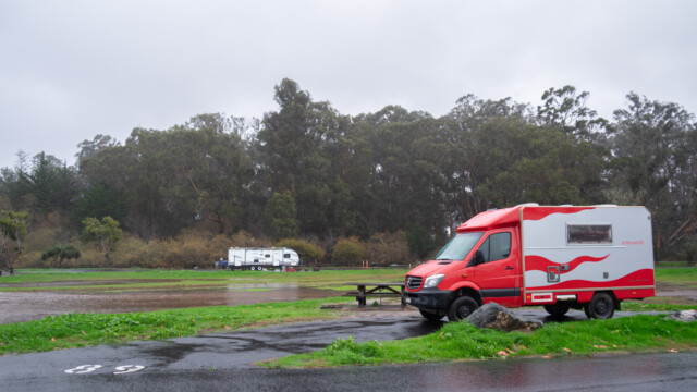 Wir kommen kurz vor dem Einnachten im State Park von San Simeon an. Leider sind zwei Drittel des Campingplatzes wegen den Unwettern gesperrt, nur etwa 30 Plätze sind noch zugänglich. Doch es hat noch genügend freie Stellflächen und wir finden ein gutes Plätzchen für Jupi, sogar mit Handy-Empfang.