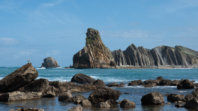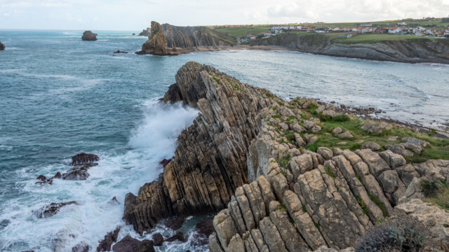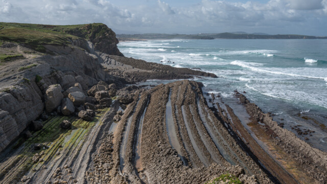 In der Region östlich von San Sebastian kommt diese Wechselfolge von Gesteinen, die manchmal nur wenig aus dem Meer herausschauen und wie ein Drachenrücken aussehen oder dann wieder wie viele übereinander geschichtete Kartons sehr oft vor. Nun, Bilder sagen mehr als umständliche Beschreibungen. Drachenrücken-Flysch sahen wir vorallem an der Küste von Barrika, die wildeste Küste mit Flysch dagegen an der Costa Cuebrada bei der Ortschaft Liencres.