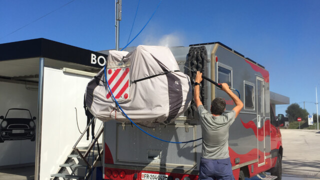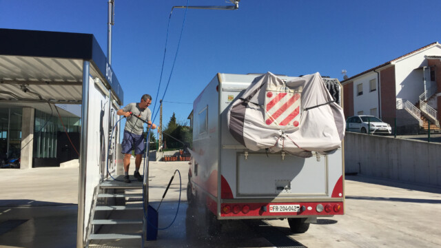 Nach den diversen teils recht staubigen Offroad-Touren in den Pyrenäen hatte Jupi, unser Bimobil EX366, wieder mal einen Waschtag verdient, wurde gründlich geschruppt und das Fahrerhaus neu eingewachst, das Rot wieder zum Glänzen gebracht.