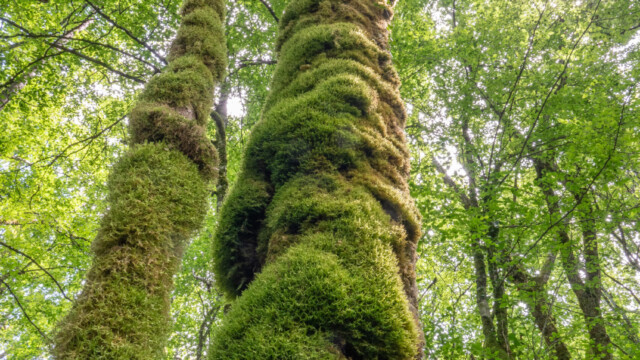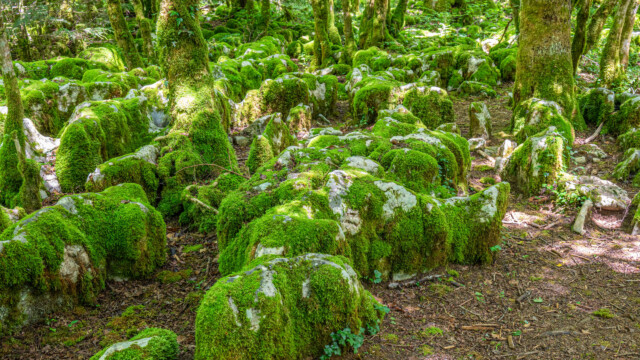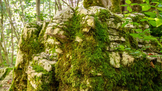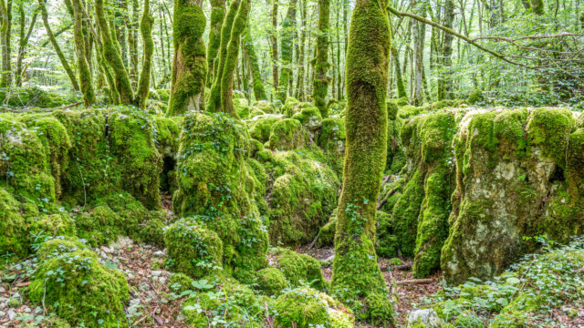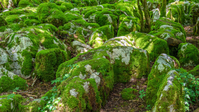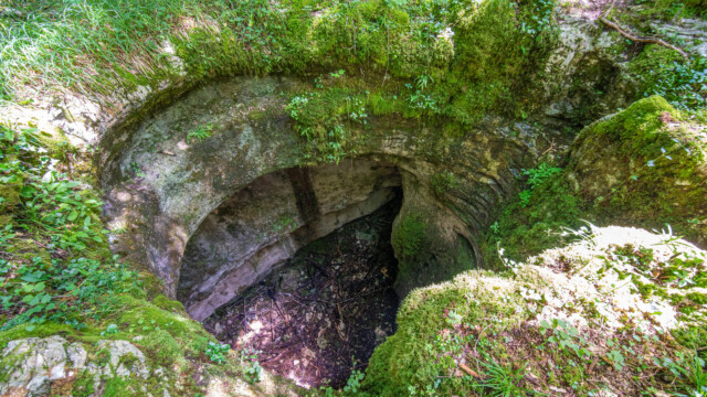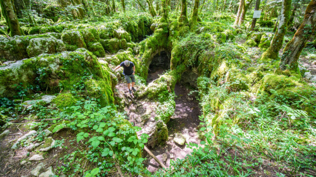 Den nächsten Stopp auf unserer Fahrt Richtung Westen unternahmen wir in der Nähe der Ortschaft Molain. Dort gibt es einen Karstweg (sentier karstique de Malrochers). Auf einer etwa 4km langen Rundstrecke wanderten wir durch karstiges Gebiet und einigen Grotten sowie Höhlen. Und wir wurden nicht enttäuscht: Die meisten Steine, Karstfelsen aber auch die Bäume waren mit einer Schicht von grün leuchtendem Moos bedeckt, was einen richtigen Zauberwald ergab.